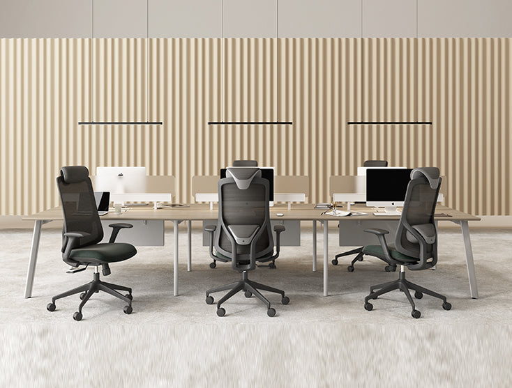 Silla de respaldo alto en malla color negro y asiento tapizado en tela color gris oscuro